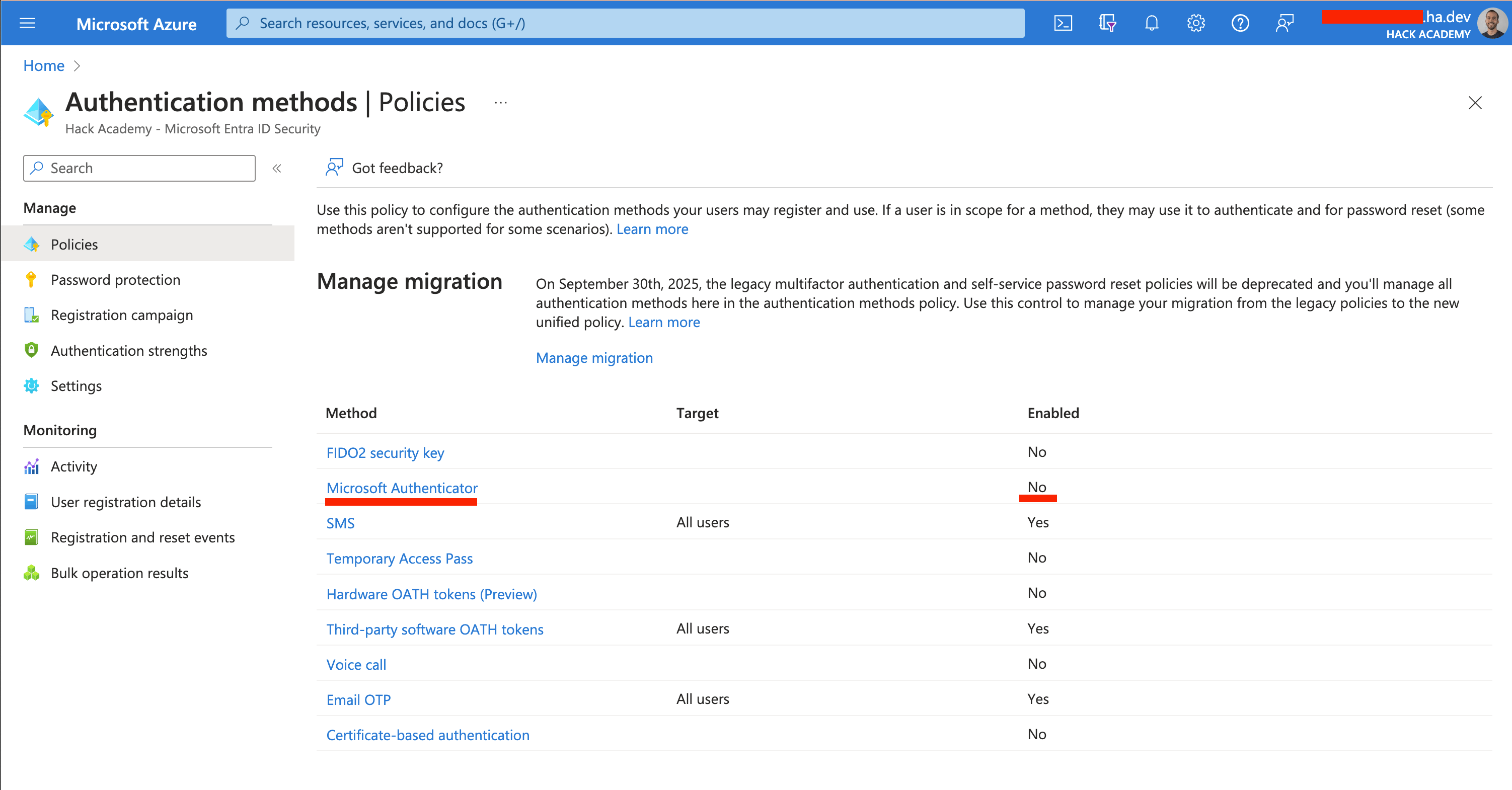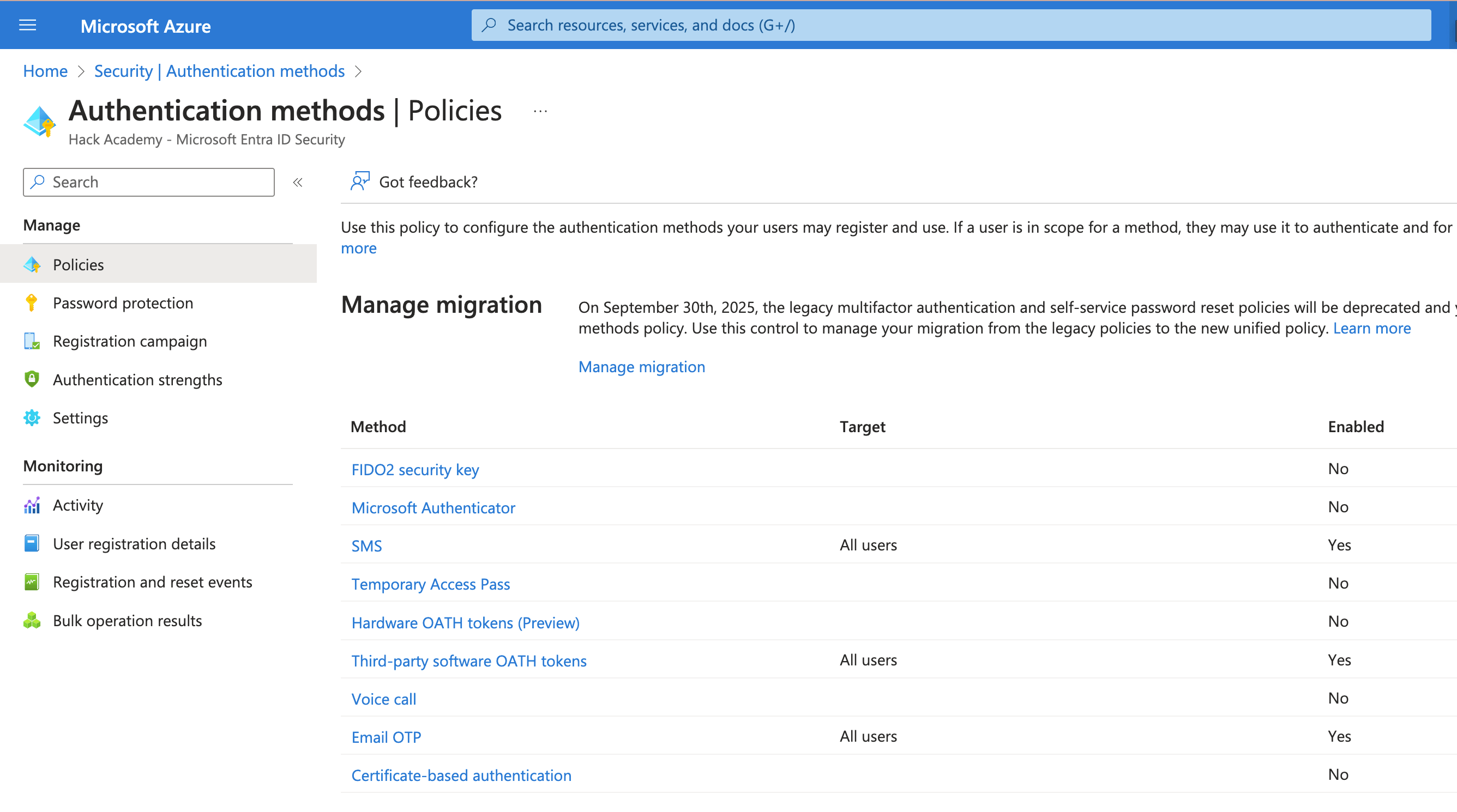 - **Go to Authentication methods:** Look for the 'Authentication methods' policy in Azure AD.