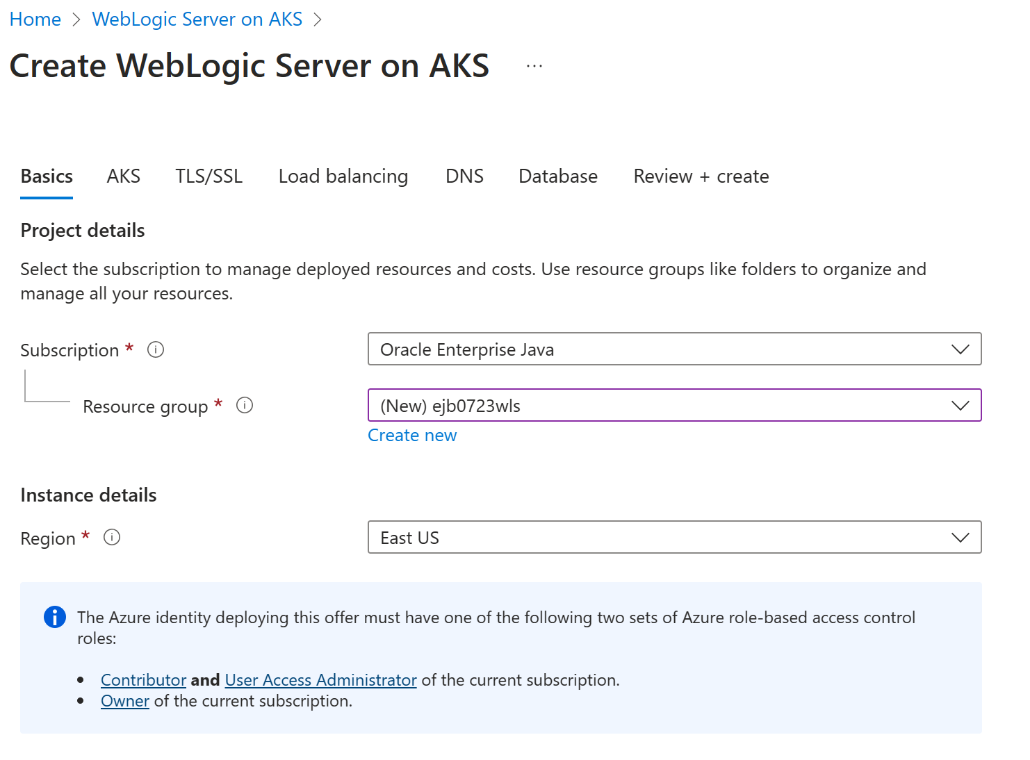 • Ensure the Azure identity you use to sign in and complete this article has either the Owner role in the current subscription or the Contributor and User Access Administrator roles in the current subscription. For an overview of Azure roles, see What is Azure role-based access control (Azure RBAC)? For details on the specific roles required by WLS on AKS, see Azure built-in roles.