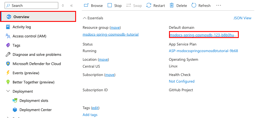 1. In the top search bar, type msdocs-spring-cosmosdb, then the App Service resource called msdocs-spring-cosmosdb-XYZ.