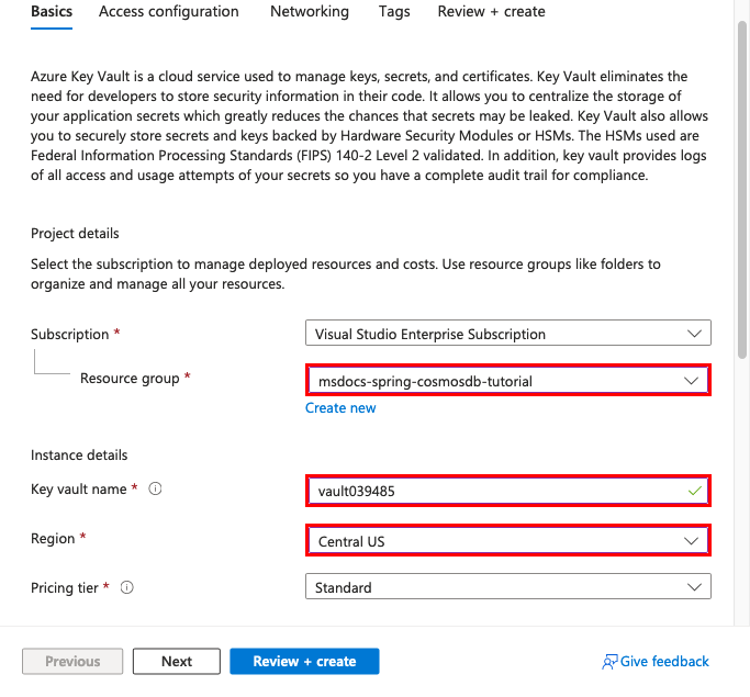 13. Select Review + create, then select Create. Wait for the key vault deployment to finish. You should see "Your deployment is complete."