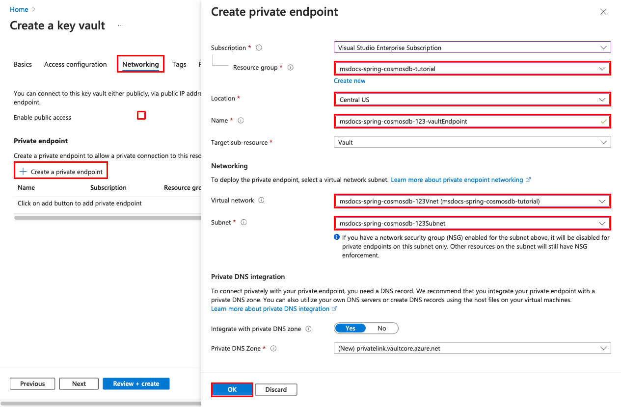 10. In Virtual network, select msdocs-spring-cosmosdb-XYZVnet.