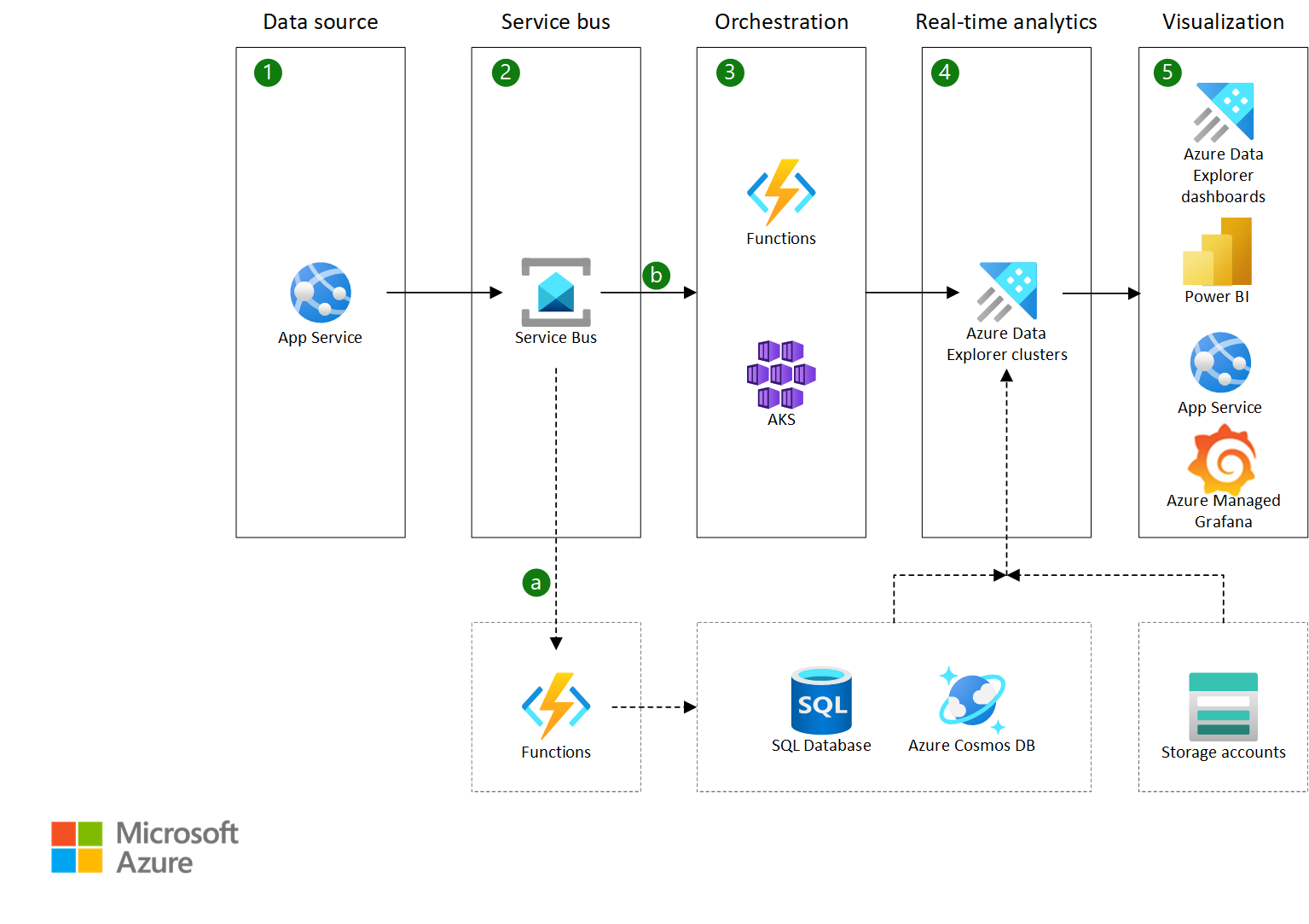 • Azure Functions is an event-driven serverless compute platform. With Functions, you can deploy and operate at scale in the cloud and use triggers and bindings to integrate services. In this architecture, Azure Functions is used to send data to an operational database via an orchestration flow or directly to Azure Data Explorer.