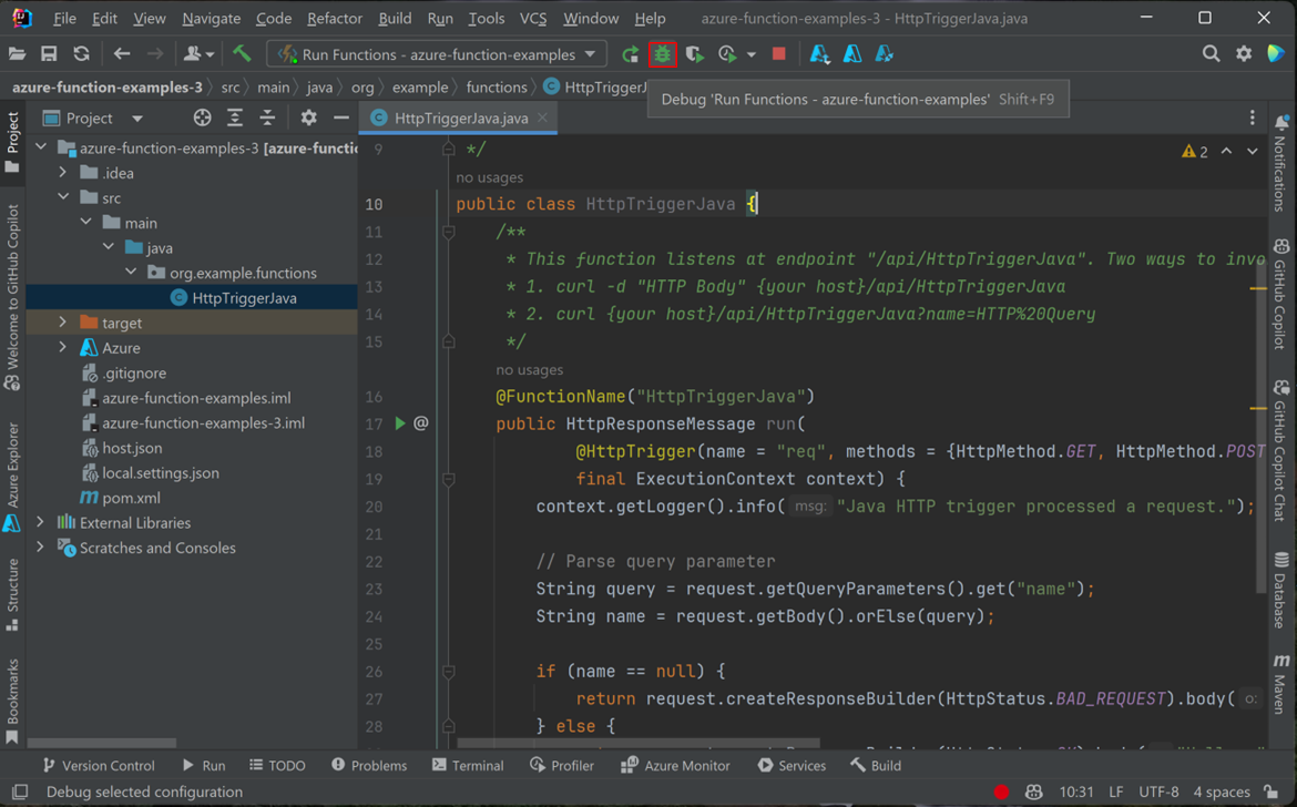1. Navigate to src/main/java/org/example/functions/HttpTriggerJava.java to see the code generated. Beside line 17, you should see a green Run button. Select it and then select Run 'Functions-azur...'. You should see your function app running locally with a few logs.