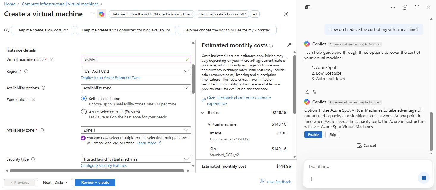Azure Copilot can guide you in suggesting different options to save costs as you deploy a virtual machine. If you're new to creating VMs, Azure Copilot can help you understand the best ways to reduce costs More experienced users can confirm the best ways to make sure VMs align with both use cases and budget needs, or find ways to make a specific VM size more cost-effective by enabling certain features that might help lower overall cost.