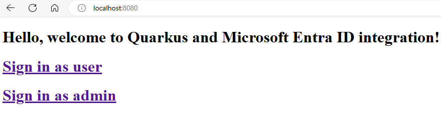 After the Quarkus app is running, open a web browser with a private tab and navigate to http://localhost:8080. You should see the welcome page with links to sign in as a user or as an admin. Using a private tab avoids polluting any existing Microsoft Entra ID activity you might have in your regular browser.