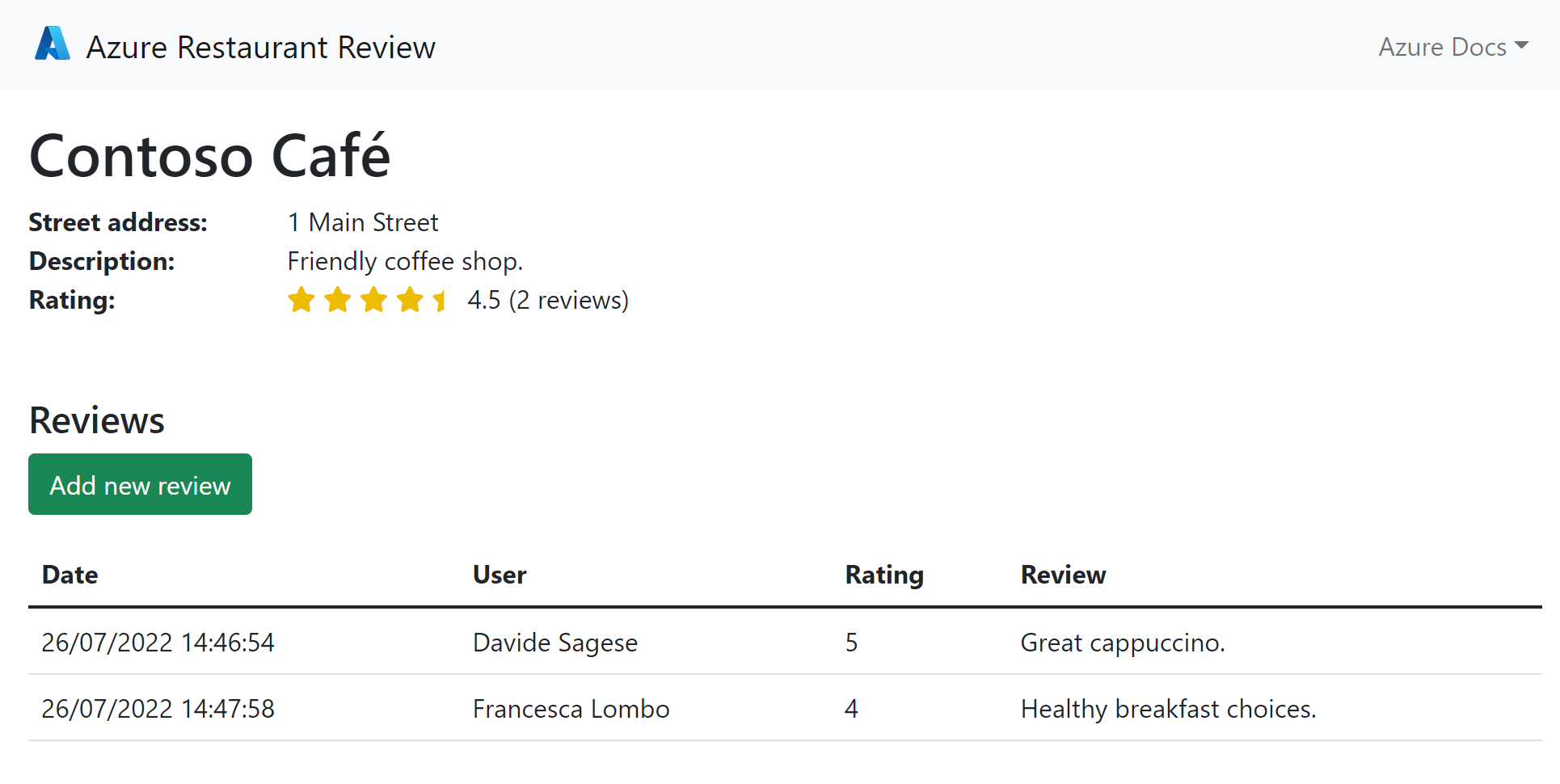 The end result of this tutorial is a restaurant review app, deployed and running in Azure, that looks like the following screenshot.