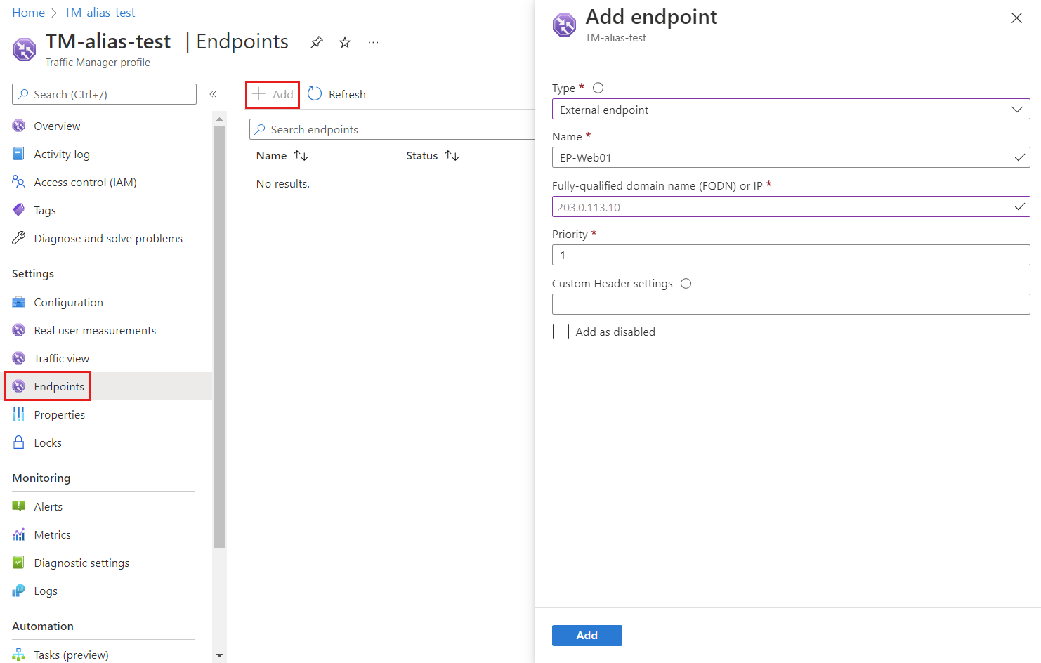 In the Endpoints page of TM-alias-test Traffic Manager profile, select + Add and enter or select the following information: