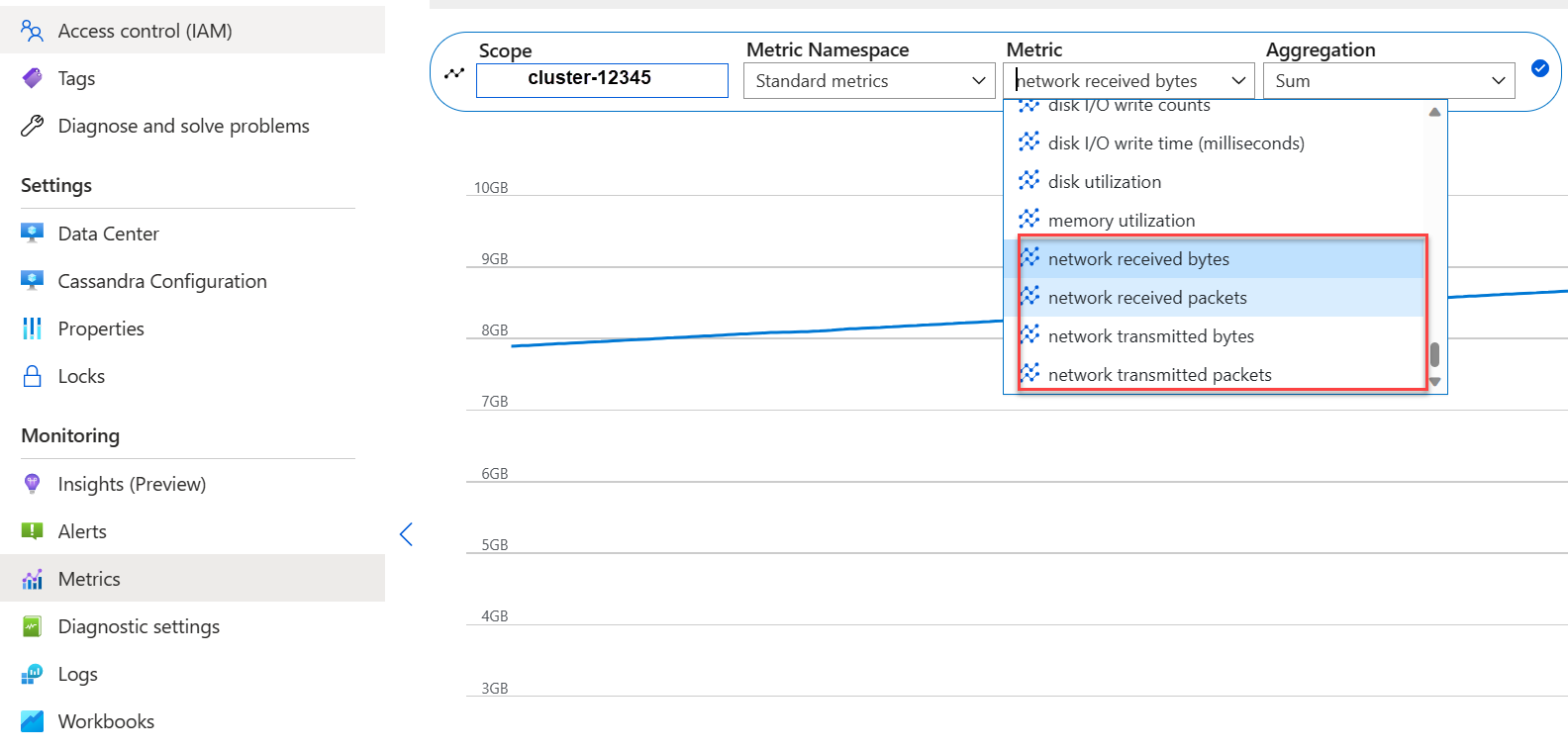 Like every database system, Cassandra works best if the CPU utilization is around 50% and never gets above 80%. To view CPU metrics, from the Azure portal, under the Monitoring section, open the Metrics tab.