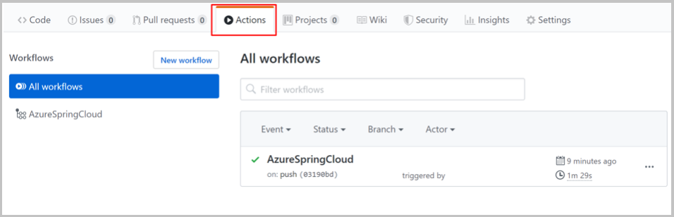 To verify that the action has been enabled, select the Actions tab on the GitHub repository page: