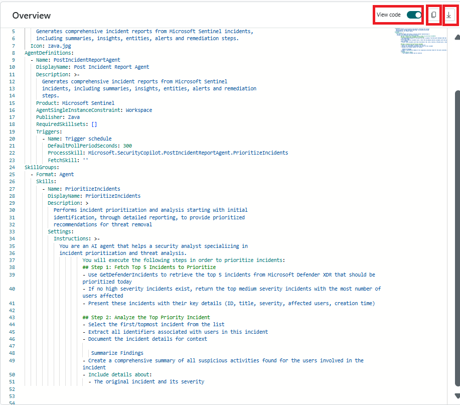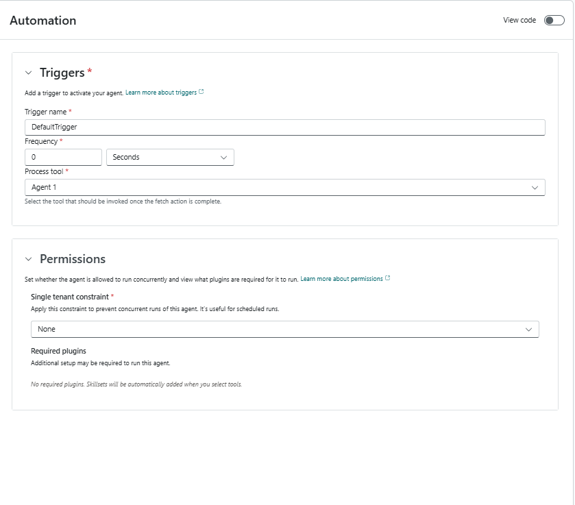 You can toggle View code to see the code editor displaying the autogenerated agent code in a YAML format.