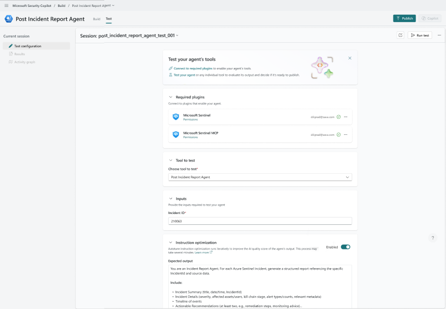 This article guides you on how to test the agent you created or its tools in Security Copilot.