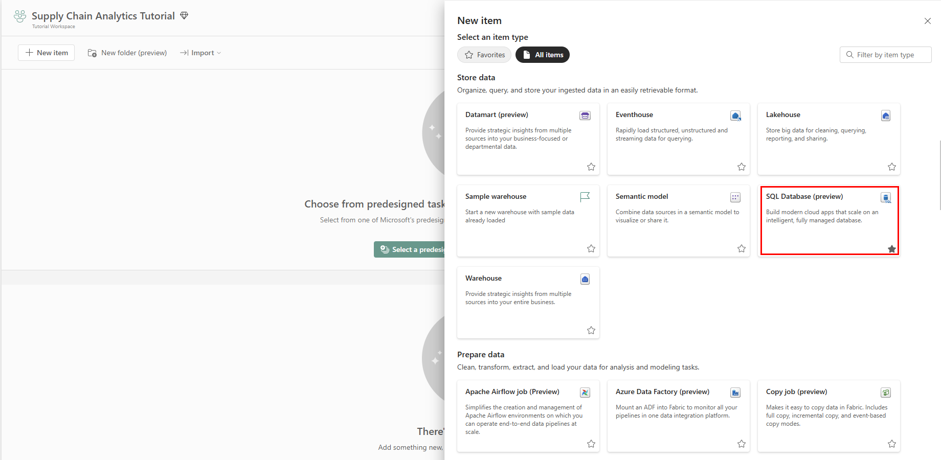 In the New Item | All Items panel, scroll to the Store Data area and select SQL database.