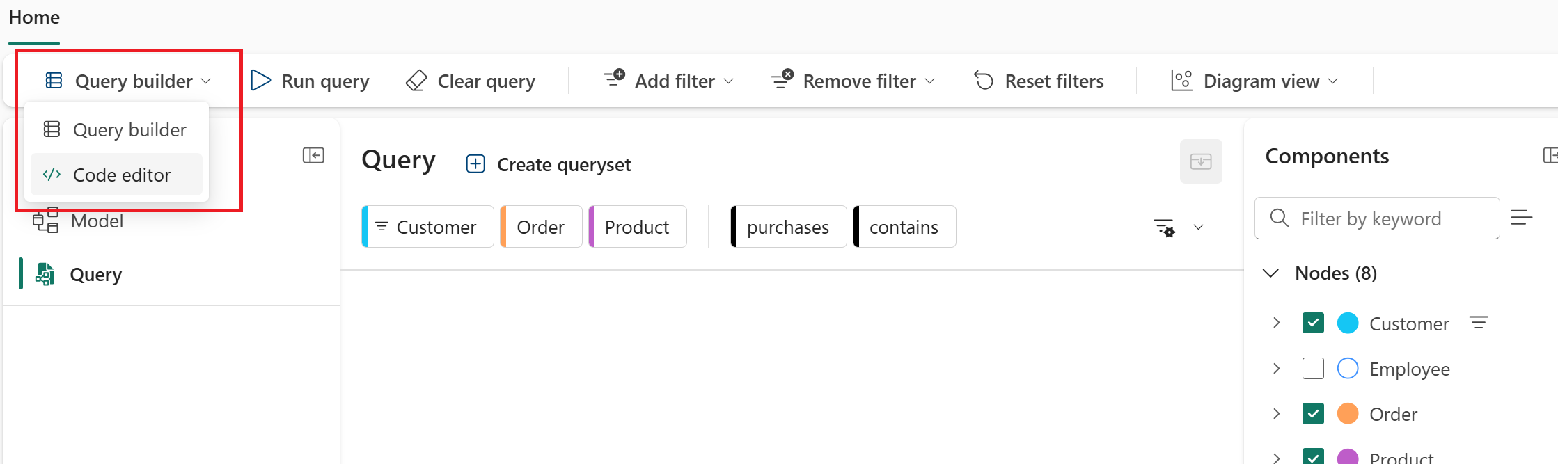 Follow these steps to switch to the code editor and start querying your graph by using GQL: