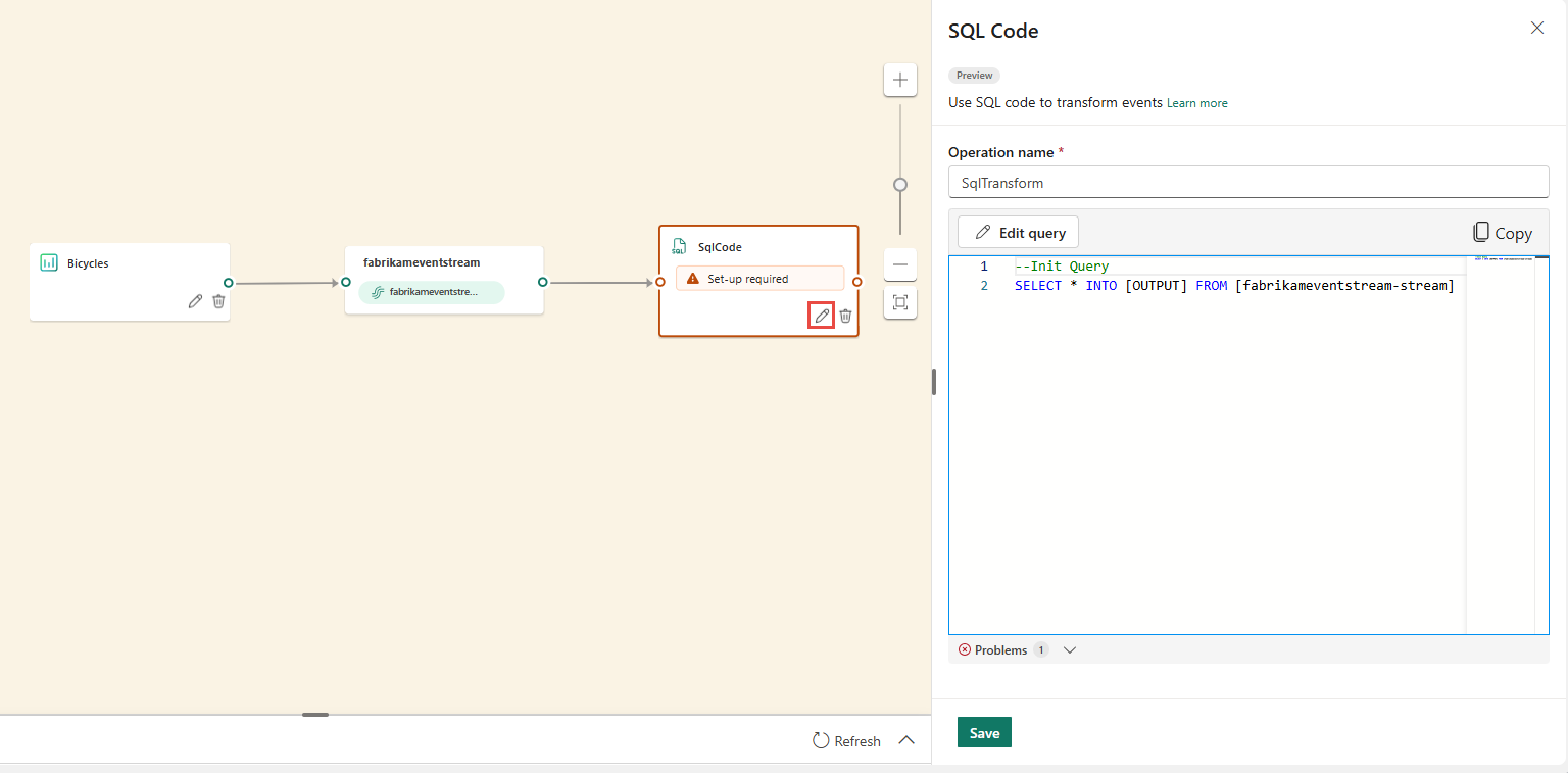 A new SQL node is added to your eventstream. Select the pencil icon to continue setting up the SQL operator.