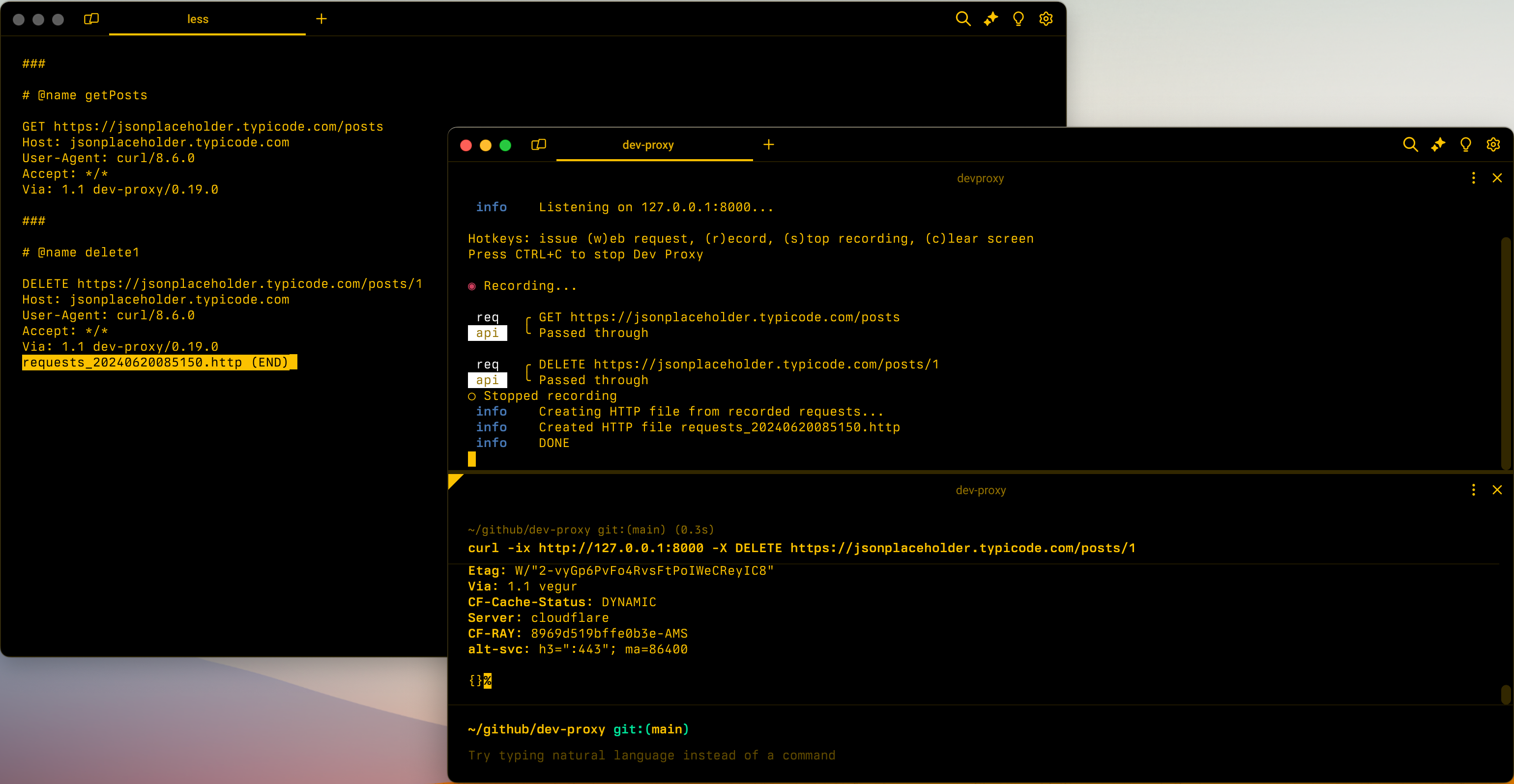 s.Dev Proxy generates an HTTP file and saves it in the current directory. The file includes all captured requests and responses, with sensitive data like bearer tokens and API keys replaced by variables. For example: