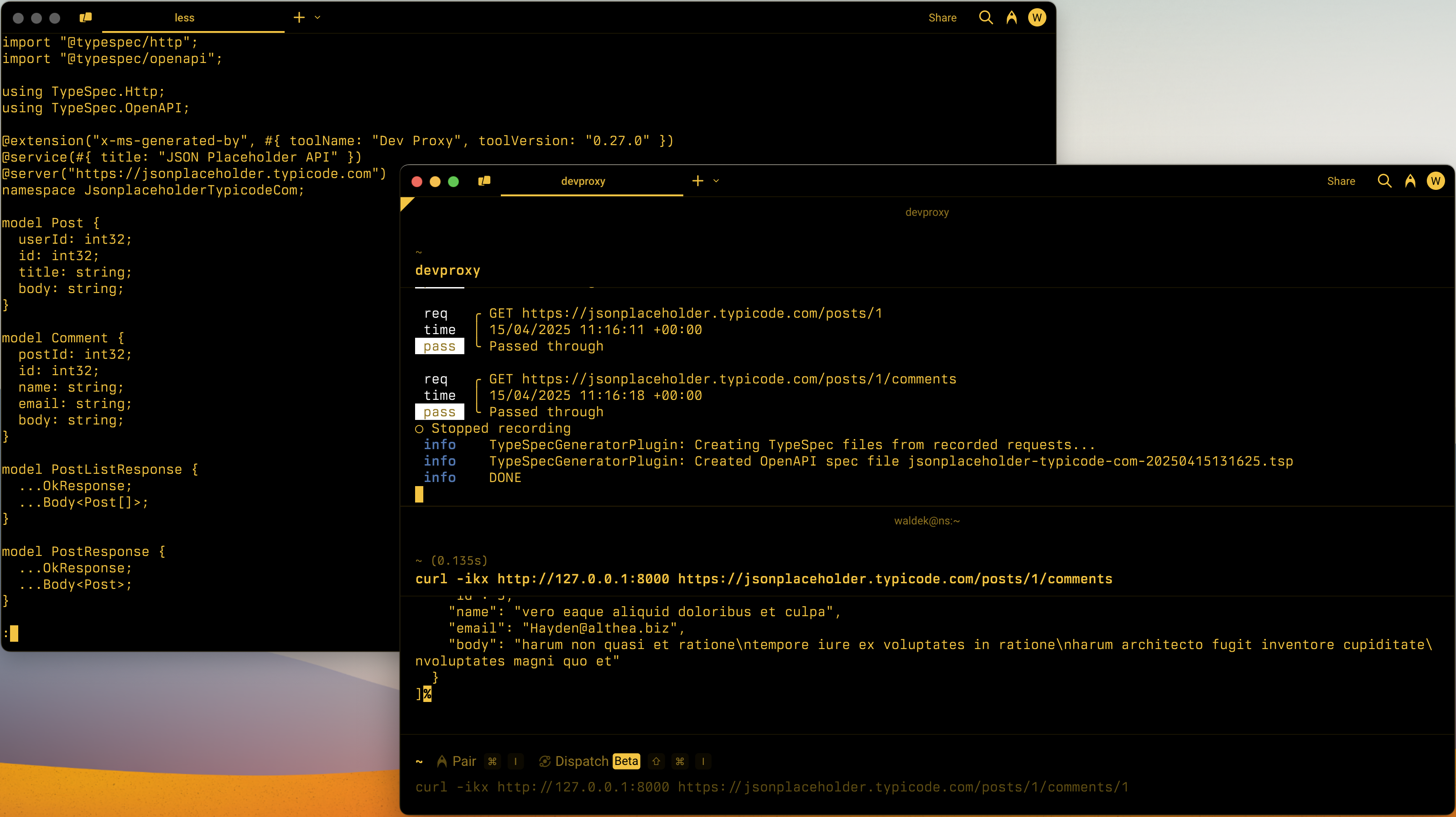 Screenshot of two command prompt windows. One shows Dev Proxy recording API requests. The other shows the generated TypeSpec file.