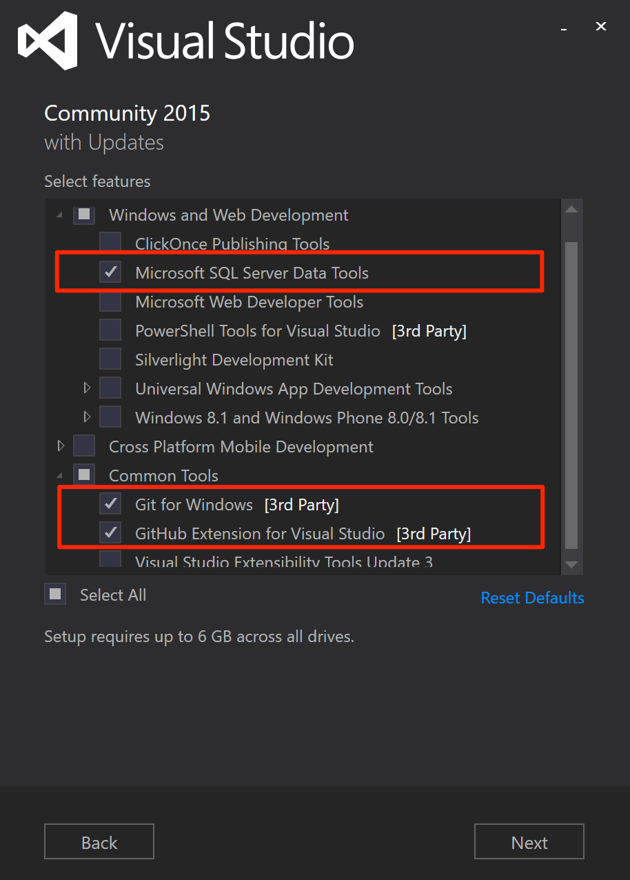 Select Microsoft SQL Server Data Tools, Git for Windows, and GitHub Extension for Visual Studio from the feature selection list.
