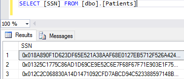 Assuming SSN is an encrypted char(11) column in the Patients table, the query shown below will return plaintext values, if Always Encrypted is enabled for the database connection and if you have access to the column master key configured for the SSN column.