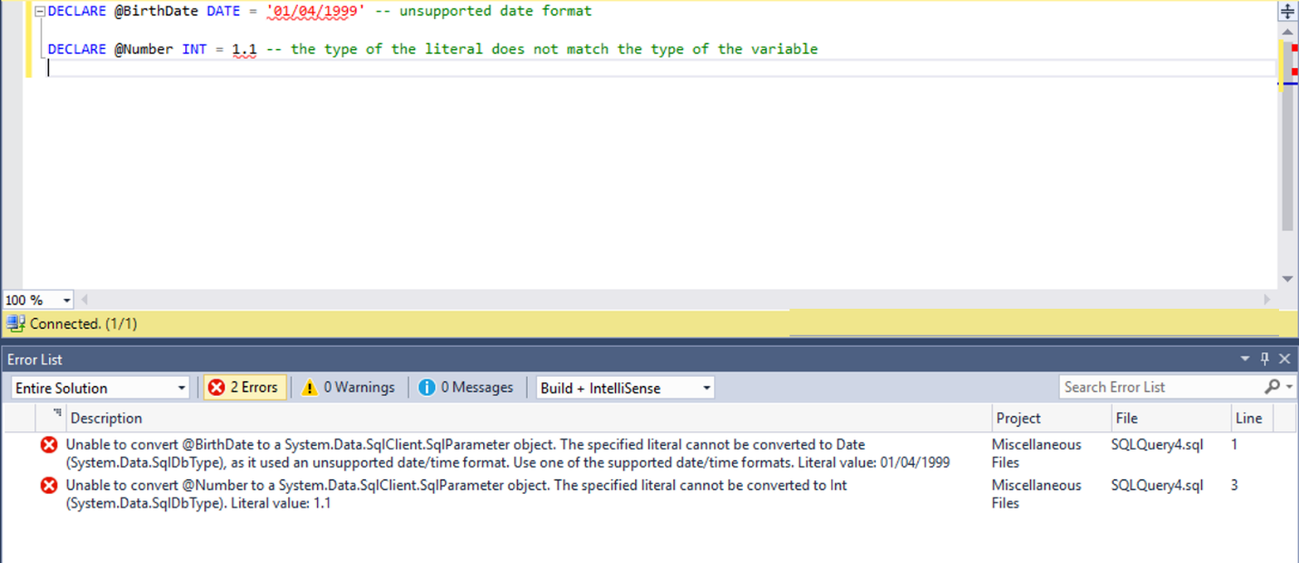 If SQL Server Management Studio has attempted to parameterize a variable, but the parameterization has failed, the declaration of the variable will be marked with an error underline. If you hover on the declaration statement that has been marked with an error underline, you'll get the results about the error. You can also see the complete list of parameterization errors for all variables in the Error tab of the Error List view. To open the Error List view, select View from the main menu and then select Error List.