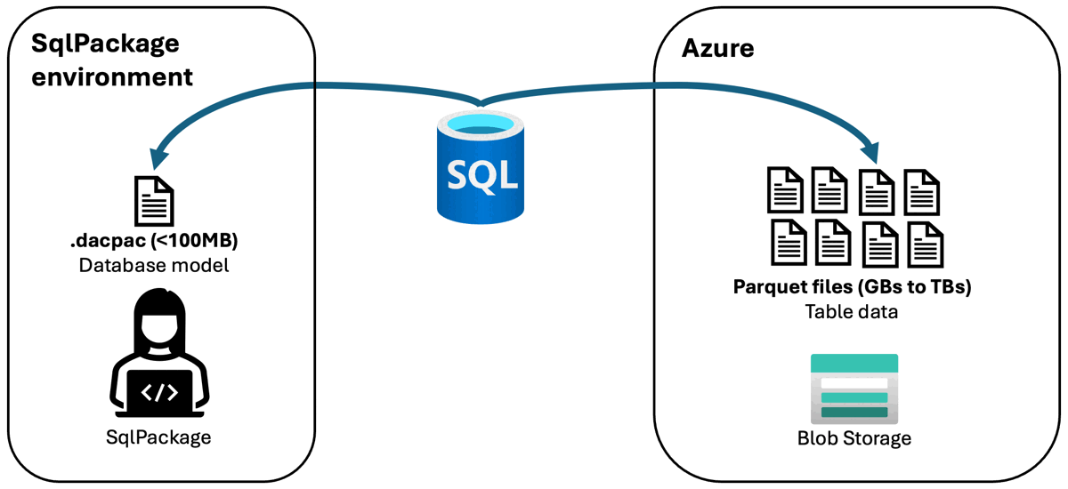 Access for publish can be authorized via a storage account key or a shared access signature (SAS) token. The database schema (.dacpac file) is read from the local client running SqlPackage and the data is read from Azure Blob Storage in Parquet format.