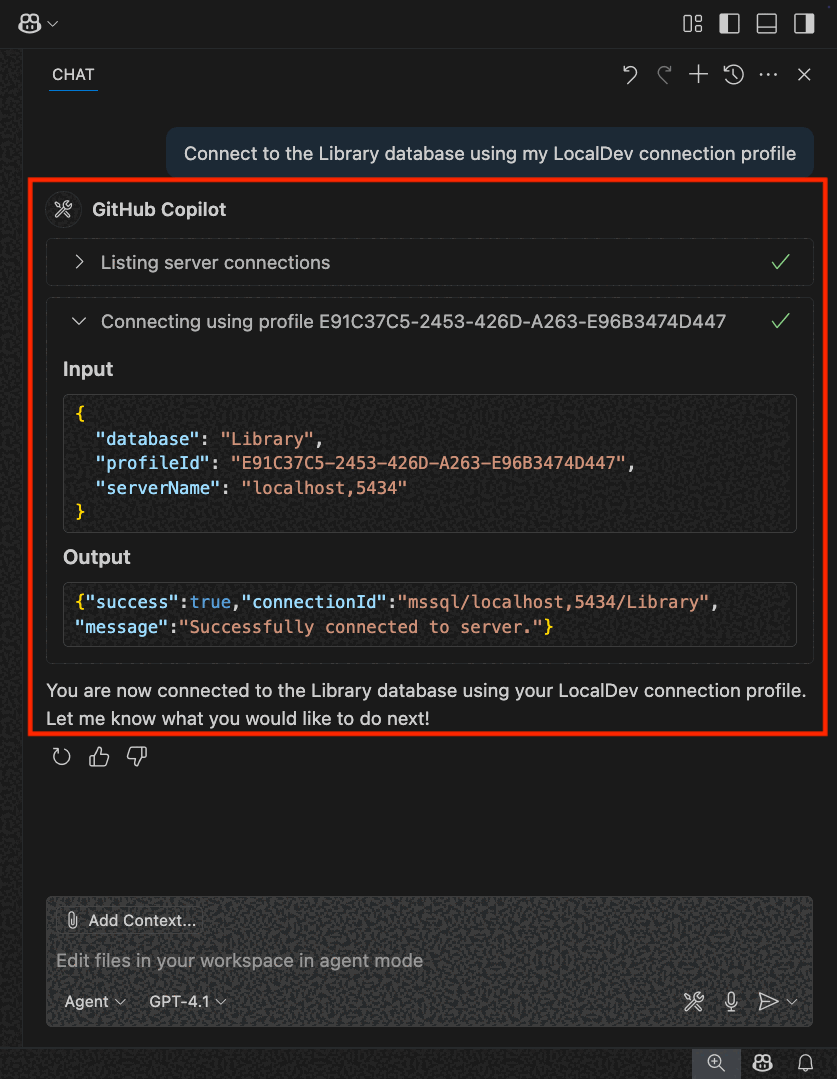 GitHub Copilot Agent Mode supports flexible ways to connect to your SQL database, either by referencing saved profiles or by specifying a server and database directly. Here's how the connection logic works.