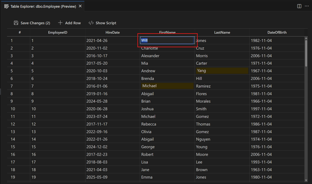 Show Script: This pane displays a read-only DML script that reflects all actions performed in the data grid in real time. This allows you to review the underlying DML operations before saving changes