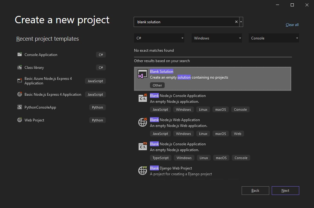 If you have several workloads installed, the Blank Solution template might not appear at the top of your list of search results. Try scrolling through Other results based on your search to find the template.
