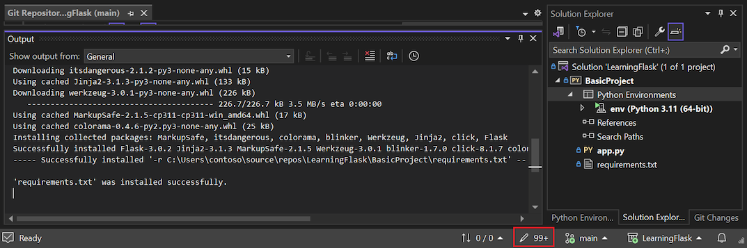If Visual Studio prompts for administrator privileges, provide your consent. Wait several minutes while Visual Studio downloads and installs packages. For Flask and its dependencies, the process can require expanding close to 1,000 files in over 100 subfolders. You can view the progress in the Visual Studio Output window.