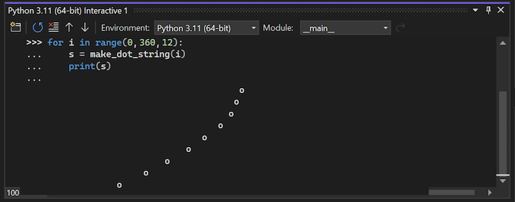 for i in range(0, 1800, 12): s = make_dot_string(i) print(s)To copy the exact contents of the Interactive Window, including prompts and any program output, use the standard Copy command.