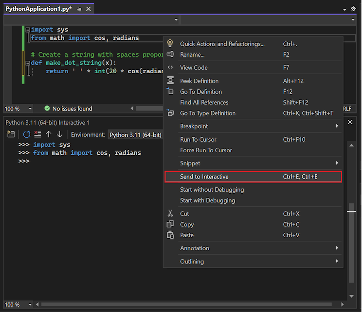 importstatement in the file and select Send to Interactive (or the keyboard shortcut Ctrl+E). Repeat this process for thefromstatement.When you select the Send to Interactive command, the selected code fragment is immediately pasted into the Interactive Window and run. In this case, Visual Studio imports the