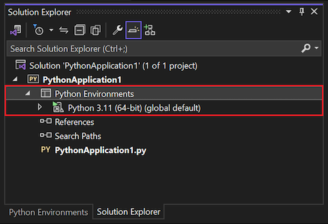 The Python Environments node in Solution Explorer lists environments currently in use by your project. If you have more than one environment for a project, Visual Studio shows the active environment in bold. You can expand a specific environment to see the set of installed packages. When an environment is active, you can import its installed packages and use them in your code.